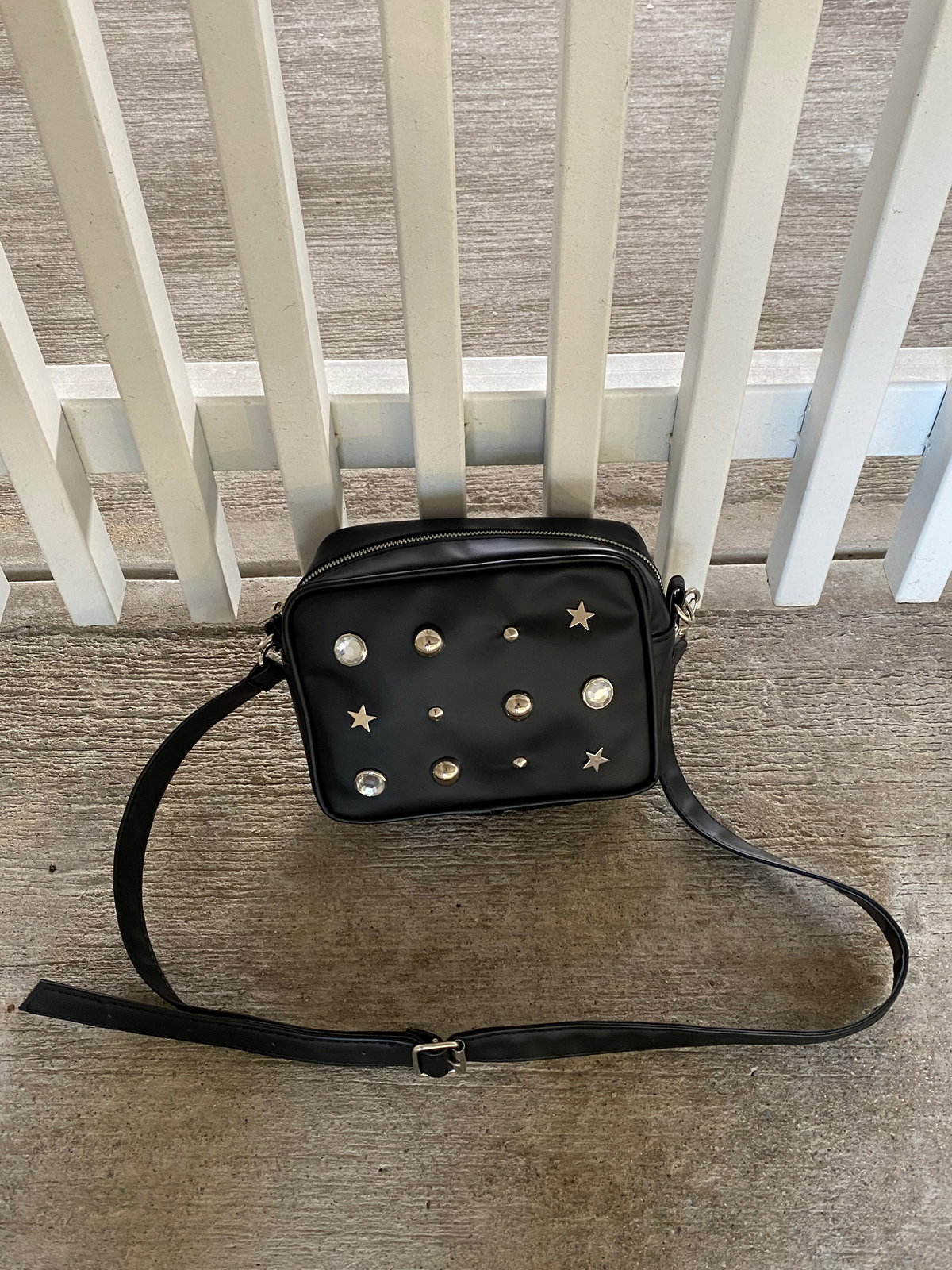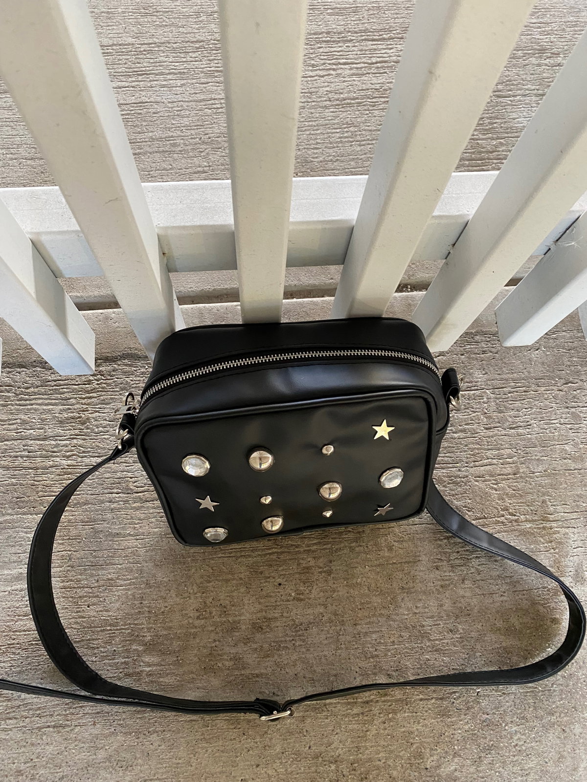 Pilar es una bandolera rígida con detalles en piedritas, estrellas y tachas que hacen la diferencia. Tiene bolsillo interno, cierre metálico y correa regulable y desmontable con detalle tipo cinto. Canchera, versátil y perfecta para usar de día o de noche.
