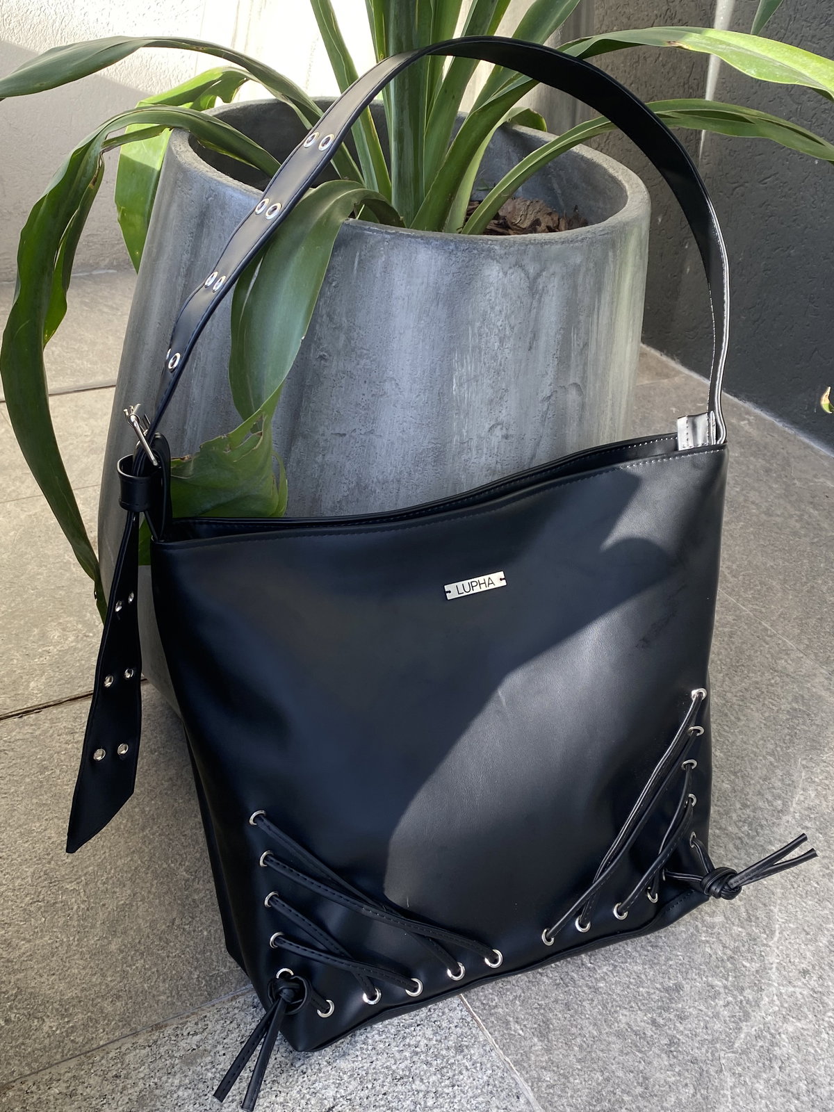 Diseño amplio y con mucha onda. Confeccionada en cuero, con detalle de cordones cruzados y ojalillos metálicos al frente.
