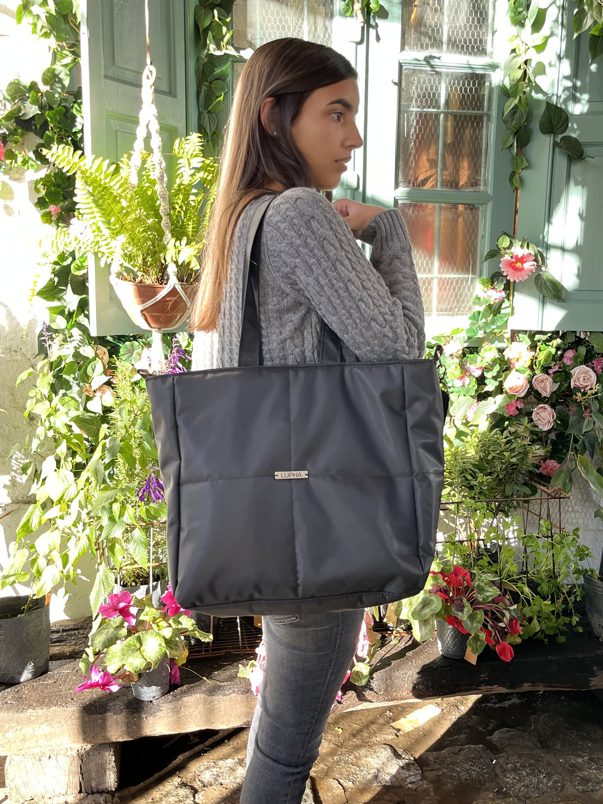 Tina es esa tote que no te falla. Hecha en tela impermeable, banca lo que sea: lluvia, rutina y todo lo que cargues en el día. Tiene el tamaño justo (35 x 35 x 15 cm) para llevar desde la compu hasta lo que se te ocurra.